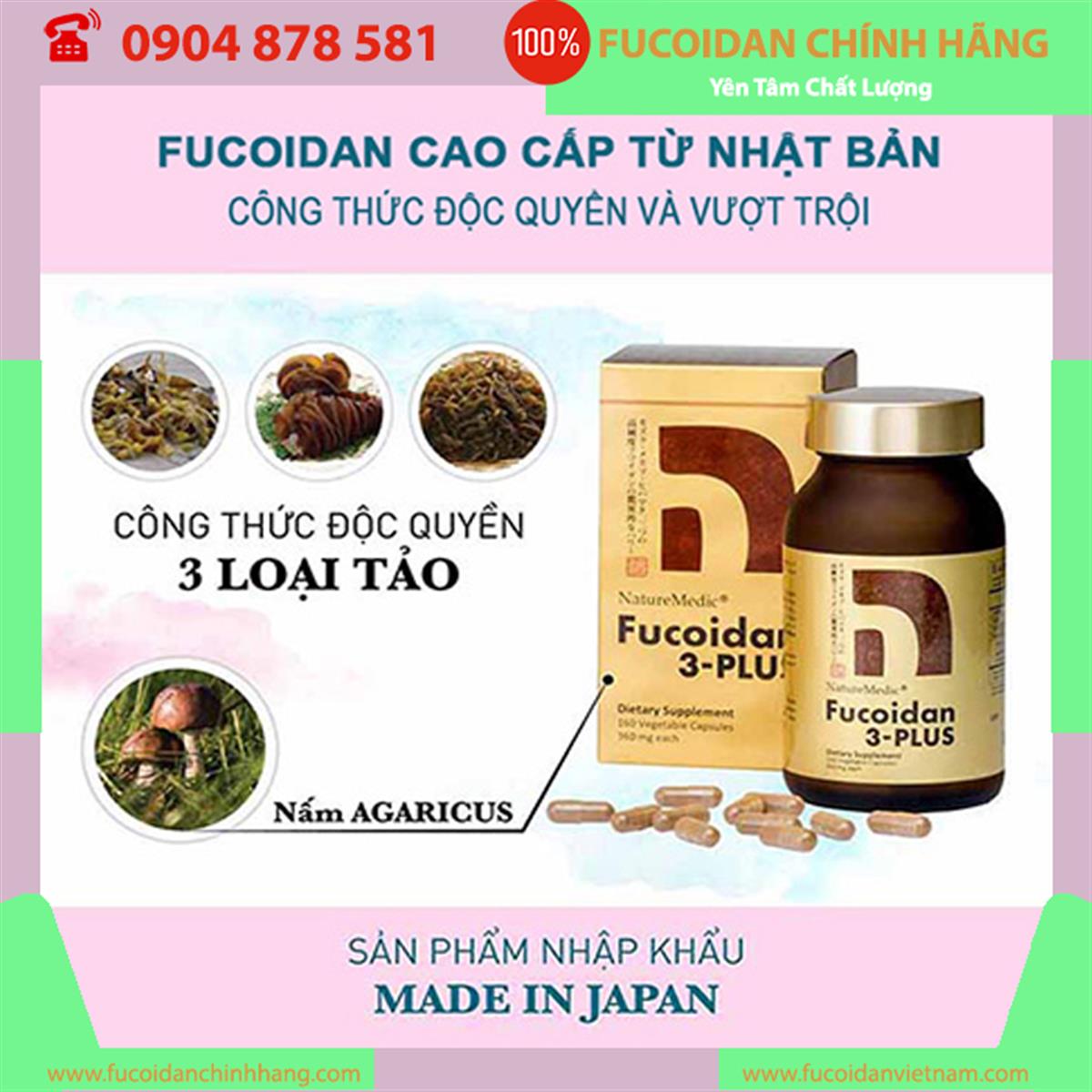 Được chiết xuất từ 3 loại Fucoidan tinh khiết cao: Mozuku, Mekabu, Fucus Fucoidan và chiết xuất sợi nấm Agaricus, Fucoidan 3-Plus là sản phẩm tiên phong trong lĩnh vực Thực phẩm Chức Năng