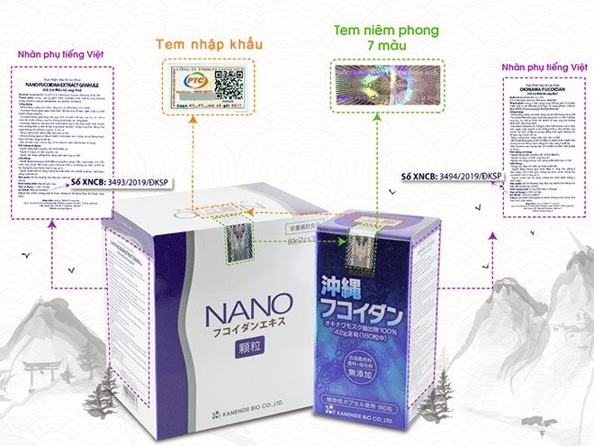 Nhãn phụ bằng tiếng Việt trên vỏ hộp có ghi thông tin sản phẩm và số xác nhận công bố (Số XNCB) được cấp bởi Cục An toàn thực phẩm – Bộ Y tế. Đồng thời, bên trong mỗi hộp TPBVSK Okinawa Fucoidan và Nano Fucoidan chính hãng đều có giấy hướng dẫn bằng sử dụng bằng tiếng Việt.
