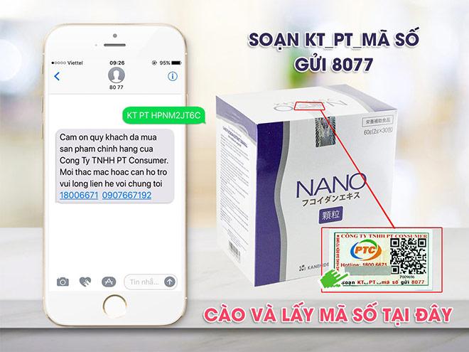 Để xác thực thông tin sản phẩm, khách hàng có thể cào lớp tráng bạc trên tem nhập khẩu để thấy mã số, sau đó thực hiện thao tác nhắn tin theo cú pháp KT (dấu cách) PT (dấu cách) Mã số sản phẩm và gửi đến 8077. Ngay sau đó khách hàng sẽ nhận được tin phản hồi từ hệ thống tự động của Công ty TNHH PT Consumer (Đơn vị đại diện cho Kanehide Bio Nhật Bản phân phối sản phẩm tại Việt Nam) với nội dung chi tiết.