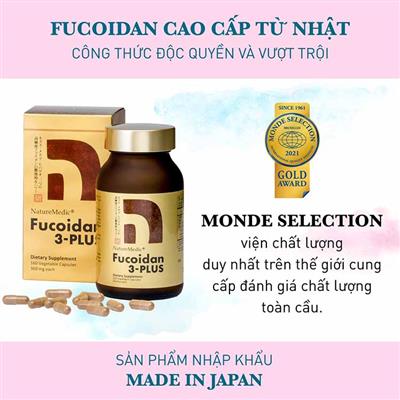 Được chiết xuất từ 3 loại Fucoidan tinh khiết cao: Mozuku, Mekabu, Fucus Fucoidan và chiết xuất sợi nấm Agaricus, Fucoidan 3-Plus là sản phẩm tiên phong trong lĩnh vực Thực phẩm Chức Năng