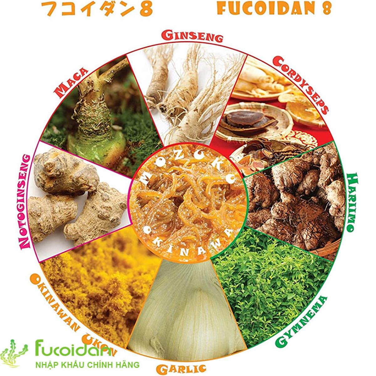 - Fucoidan được chiết xuất từ tảo nâu Mozuku vùng Okinawa được pha trộn cùng 8 loại dược liệu quý.